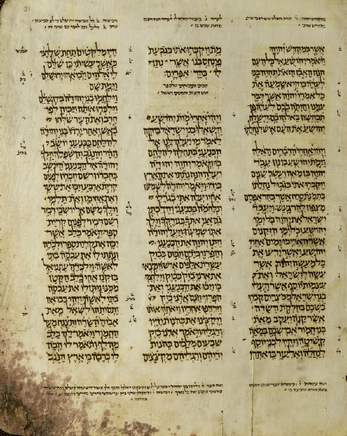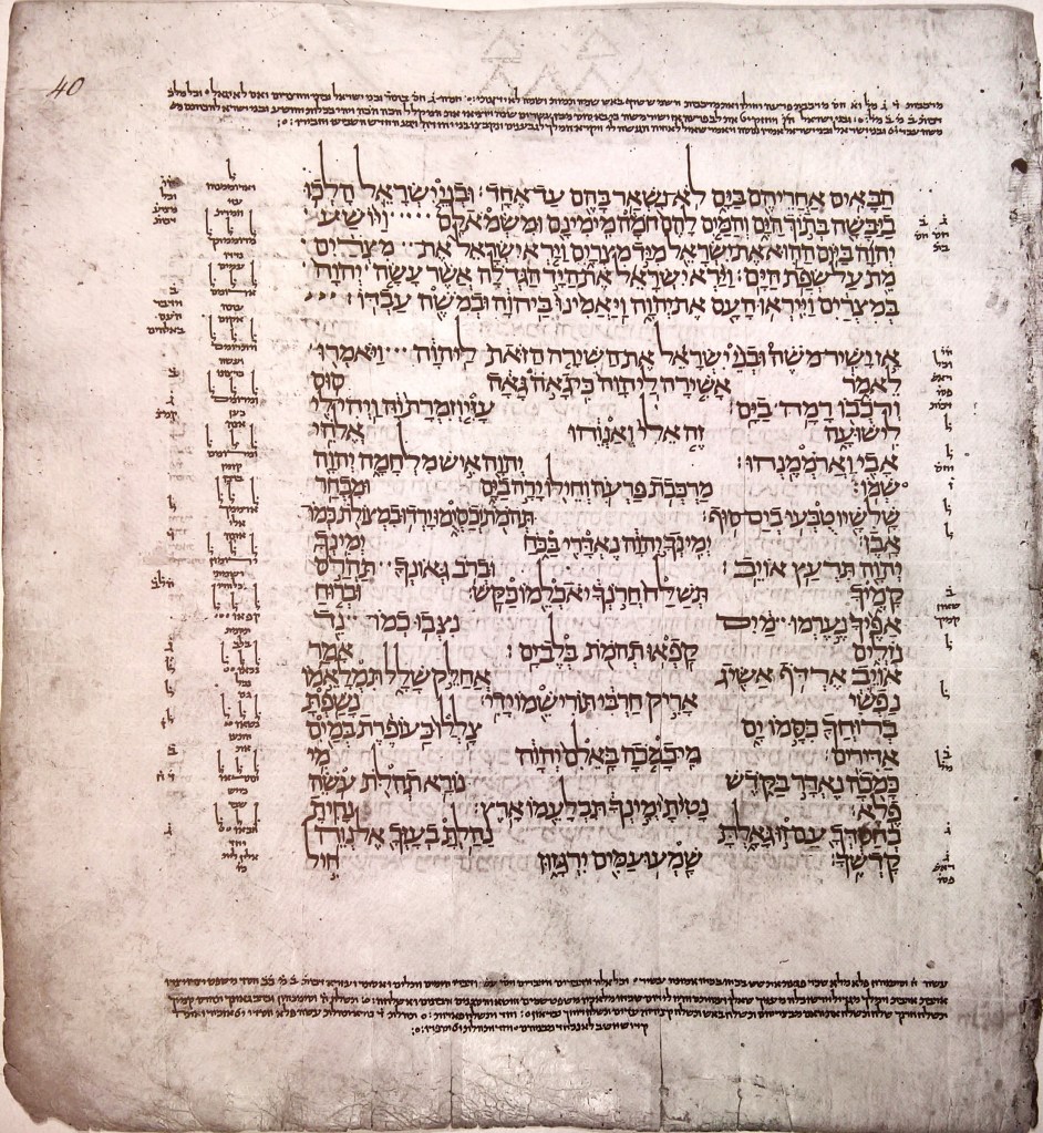 This particular folio presents the end of Exodus 14 and the opening of Exodus 15, which is written with special formatting. Normally the text appears in justified columns without so many gaps (the breaks here should resemble bricks in a wall). The primary text is clearly recognizable in the middle with the paratextual elements surrounding it in the margins and the accents and vowels above and below the consontal text.